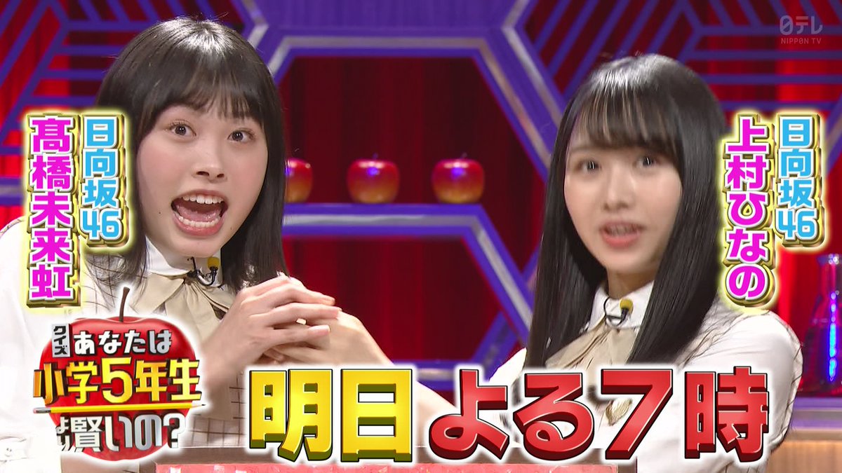 09/10 19:00〜19:56 日本テレビ系「クイズ!あなたは小学5年生より賢いの?」上村ひなの・高橋未来虹